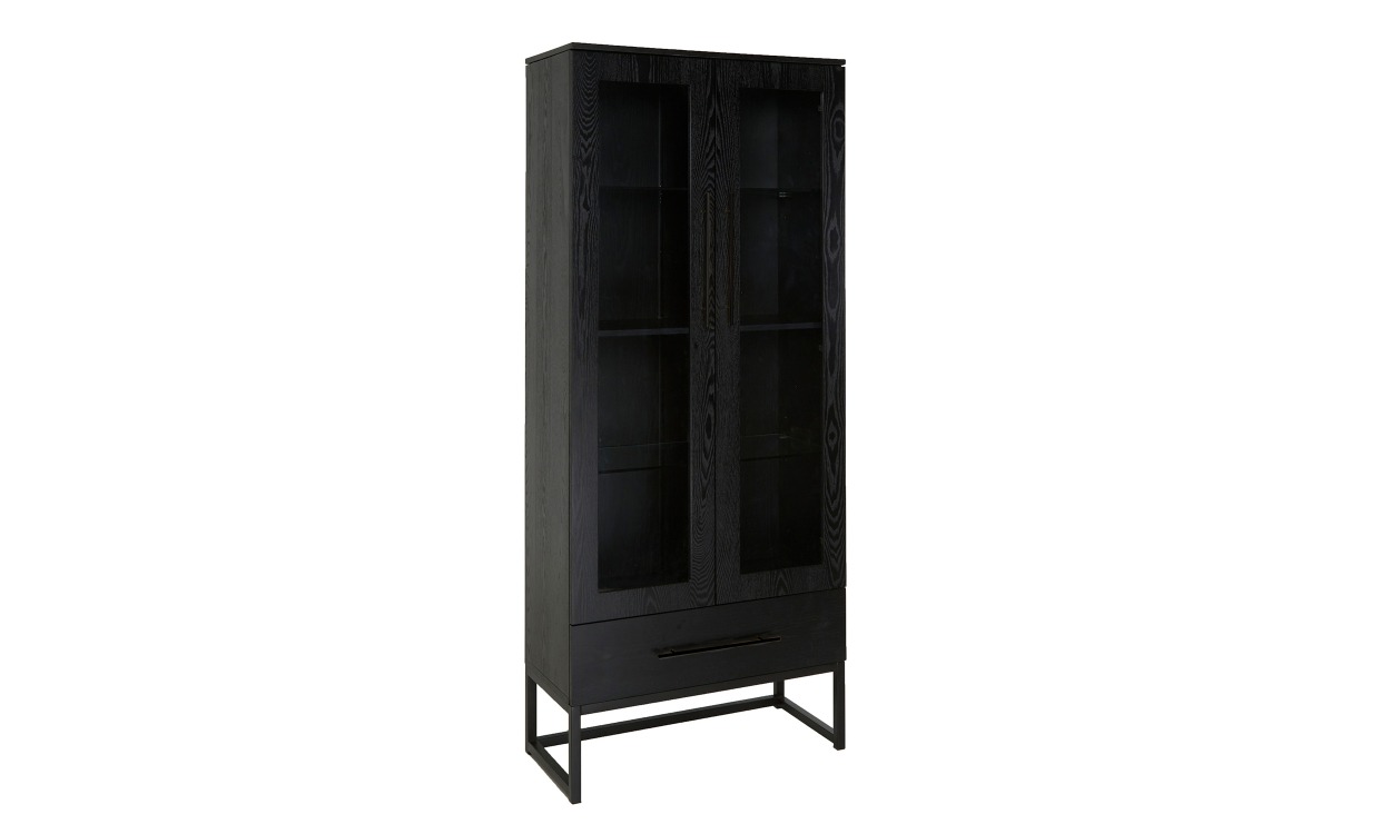 Alex är ett stilrent vitrinskåp som ger ett modernt uttryck. Vitrinskåpet har utöver dess fyra hyllplan även en låda nedtill som ger bra förvaringsmöjligheter. Tack vare dess stilrena design passar vitrinskåpet in i hemmets alla rum.Design & egenskaperSvart vitrinskåp i trä med glasdörrar.Tillverkat i ask med underrede och handtag i metall.Leverans & förpackningLevereras omonterad.Antal förpackningar: 1 stVikt: 74 kg