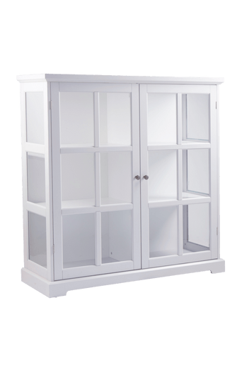 Vitrinskåp i MDF med dörrar i glas och silverknoppar. Djupa hyllor som gör att du får plats med mycket. Skåpet har lackad yta. Maxbelastning hyllplan: 20 kg. Levereras omonterat. Monteringsanvisning medföljer. Material: MDF och glas. Storlek: Höjd 120 cm, bredd 120 cm, djup 40 cm. Skötselråd: Torkas av med lätt fuktad trasa.