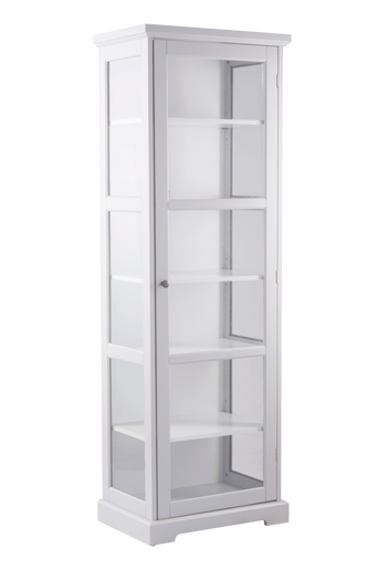 Vitrinskåp i MDF med dörrar i glas och silverknoppar. Djupa hyllor som gör att du får plats med mycket. Skåpet har lackad yta. Maxbelastning hyllplan: 20 kg. Levereras omonterat. Monteringsanvisning medföljer. Material: MDF och glas. Storlek: Höjd 180 cm, bredd 60 cm, djup 40 cm. Skötselråd: Torkas av med lätt fuktad trasa.
