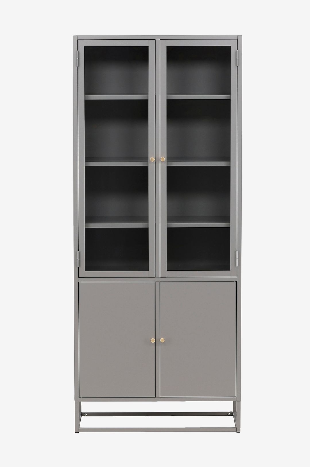 Vitrinskåpet är ett populärt tillskott till inredningen med eleganta förvaringsmöjligheter! Skåpet från serien Bakal har en modern design med raka strukturer, tillverkad i pulverlackerat ljusgrått stål. Skåpet har två dörrar i glas som ger härligt ljusinsläpp i skåpet med fyra avlastningsytor för ditt finporslin eller vackra inredningsdetaljer. Samt två lägre luckor för dold förvaring. Det här är ett vitrinskåp som erbjuder det bästa av två världar helt enkelt – välj vad du vill visa upp och vad som behöver smart förvaring.