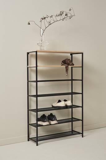 Skohylla i praktisk modell, tillverkad av järn och ek i snygg kombination. Denna skohylla rymmer många par skor då den har fem hyllplan för skor och överst har den dessutom två ekhyllor för allt från vantar till mobiler, nycklar och små väskor. Hyllan har fyrkantig profil i ramen, skohyllorna har klätts med fint nät av metall. De två översta trähyllorna har skönheten som bara ek kan ha. Att samla skorna på höjden är perfekt i en liten hall och du får mycket lättare att hålla ordning. Att golvyta frigörs är bra för framkomligheten. Viss montering krävs. Monteringsanvisning medföljer. Material: Järn och ek. Storlek: Höjd 110 cm, bredd 70 cm, djup 24 cm. Höjd mellan hyllplan: 17 cm. Frihöjd under möbel: 19 cm. Maxvikt: 10 kg per hyllplan. Skötselråd: Torkas av med lätt fuktad trasa. Tips/råd: Skohyllan CRAIK är superfin i växthuset, för krukor, redskap och småplantor.