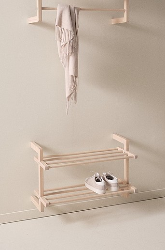 Skohylla av FSC-certifierad furu. Denna väggmonterade skohylla är i stilren, nordisk design med två hyllor för skor. Modellen är praktisk då skohyllan kan monteras på väggen i den höjd du önskar. Har du robotdammsugare placerar du skohyllan så att dammsugaren går fritt. Väggfästena är dolda så du får snygg upphängning. Viss montering krävs. Produkten är certifierad med FSC vilket innebär att den består av trä som är avverkat från ett ansvarsfullt skogsbruk som tar hänsyn till människor och miljö. Licensnummer & testinstitut: GFA-COC-004086 GFA Certification. Material: Furu. Storlek: Höjd 45 cm, bredd 70 cm, djup 38 cm. Skötselråd: Torkas av med lätt fuktad trasa. Tips/råd: Skapa ordning i din hall och komplettera med en praktisk klädhängare. Denna skohylla kan också användas som hatthylla.