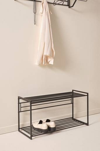 Skohylla i stål med matt, pulverlackerad yta. EVERLY har gavlar av fyrkantsprofil och hyllorna består av runda ribbor, en klassisk modell som passar in överallt och håller länge. Skohyllor frigör golvyta på ett smidigt sätt. Viss montering krävs. Monteringsanvisning medföljer. Material: Stål. Storlek: Höjd 40 cm, bredd 80 cm, djup 30 cm. Frihöjd under möbel: 2,5 cm. Maxvikt: 5 kg per hyllplan. Skötselråd: Torkas av med lätt fuktad trasa. Tips/råd: EVERLY är en hel hallserie med många delar, inred din hall enhetligt och snyggt.
