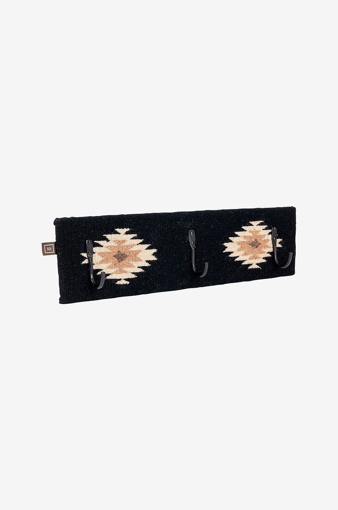 Klädhängare klädd i kelimtyg i ull med beige/brunt mönster på svart botten. Med 3 krokar i metall.