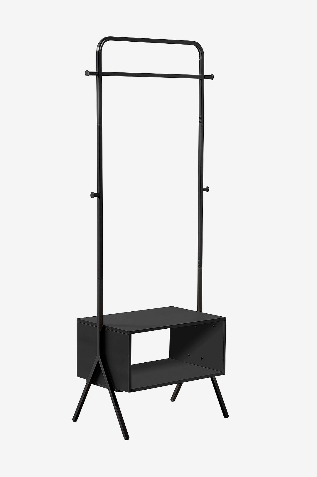 Klädhängare med stomme av stål med en praktisk, svartmålad hylla i botten. En stilren klädhängare som gör det enkelt och bekvämt att organisera dina kläder och skor. Material: Stål. Storlek: Höjd 180 cm, bredd 74 cm, djup 42 cm. Skötselråd: Torkas av med lätt fuktad trasa.