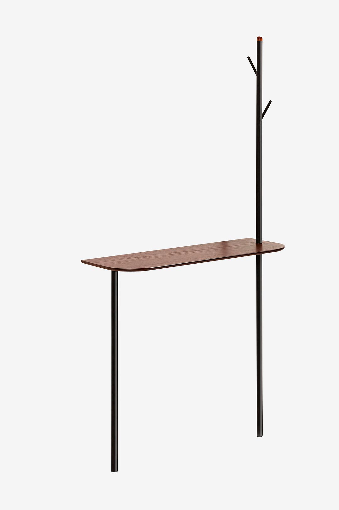 Marcolina klädhängare med avlastningsbord, skiva upptill av ekfaner med valnötsfinish och stomme av matt, svartmålad metall. Inbyggd klädhängare av metall, på höger sida av avlastningsbordet. Bredd: 80 cm, djup 30 cm, höjd 160 cm.