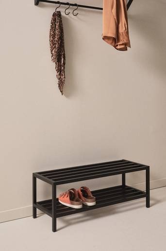 Skohylla i stål med matt, pulverlackerad yta. PRESTON är en snygg och praktisk skohylla som samlar skorna på ett ställe. Material: Stål. Storlek: Höjd 30 cm, bredd 80 cm, djup 30 cm. Höjd mellan hyllorna 18 cm. Maxvikt: 120 kg. Skötselråd: Torkas av med lätt fuktad trasa.