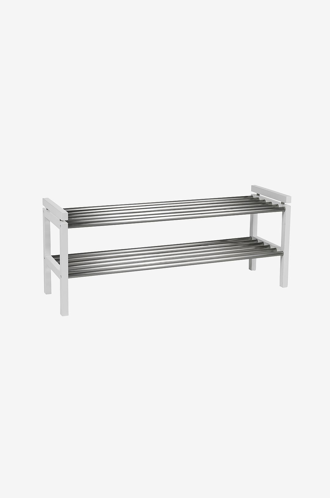 Confetti skoställ.Dekorativa ribbor i metall. Bredd 100 cm, höjd 40 cm, djup 30 cm. Stilren och enkel att placera. Skostället ingår i vår hallserie Confetti.
