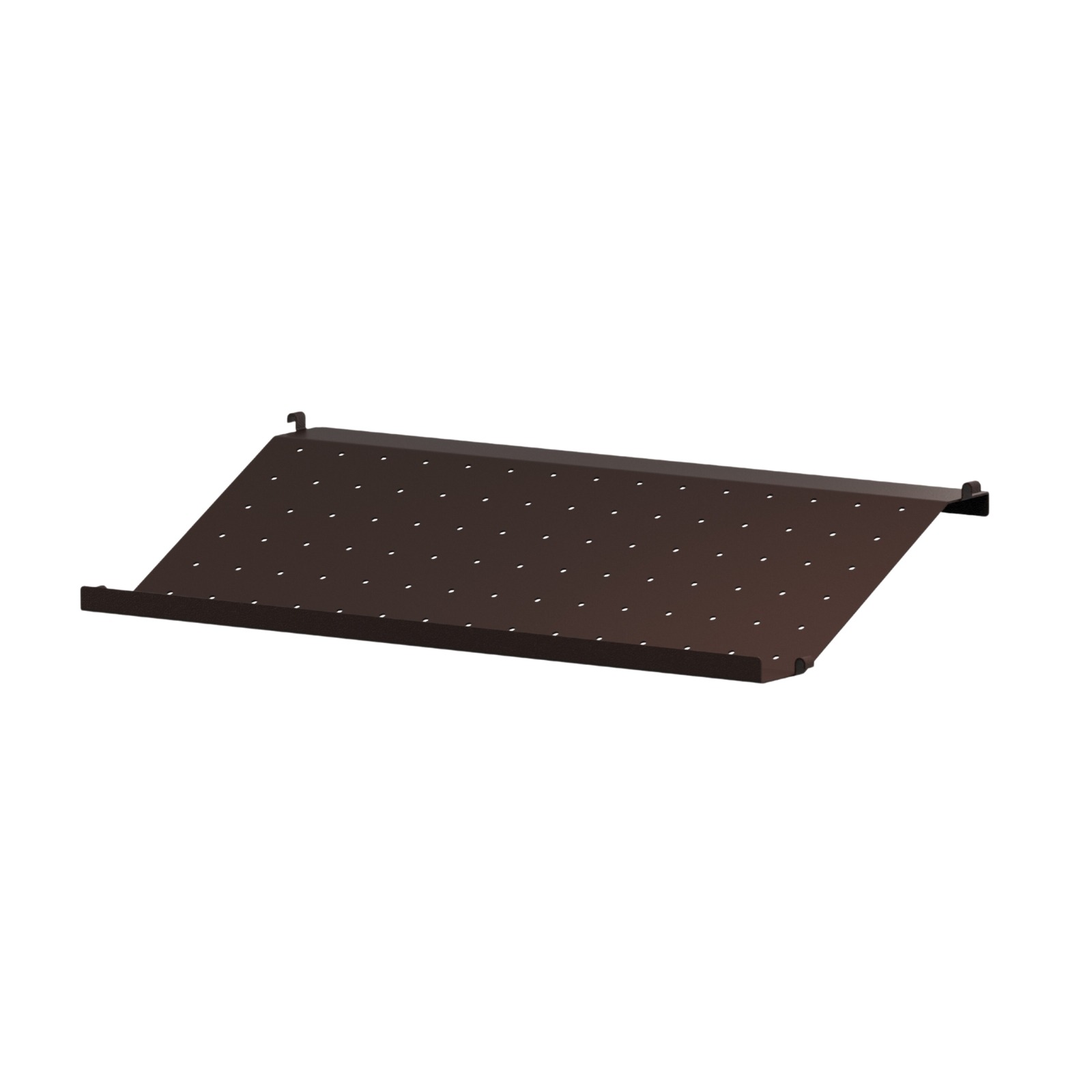String skohylla i strukturlackad perforerad metall, perfekt till hallen. Formgiven av Anna von Schewen & Björn Dahlström för String Furniture. Upphängning ingår. Passar till gavlar med djup 30 cm. Säkerhet: 15 kg jämnt fördelat på hyllplanet. Skötselråd: Torka av ytan med en trasa. Torka med en fuktig trasa med rengöringsmedel. Torka sedan ytan torr med en trasa. Ta bort fläckar med ett icke-slipande rengöringsmedel. Använd aldrig stålull. Återvinning: Lämna in dina gamla möbler till välgörenhet eller lämna in på återvinningscentral