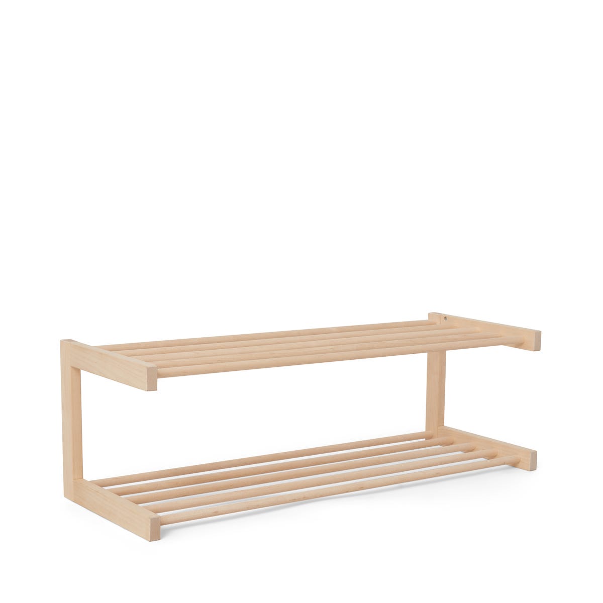 Skoställ i obehandlad björk med två hyllor. Skostället kan monteras på väggen eller stå direkt på golvet. En praktisk möbel som passar perfekt både i den stora och lilla hallen. Fin att matcha med vår hatthylla i samma serie.Du kan ge den en personlig touch och anpassa den till din inredningsstil och färgscheman. Obehandlat björkslag har en tendens att gulna över tid, så behandla gärna skohyllan med dekorvax om du vill behålla färgen.