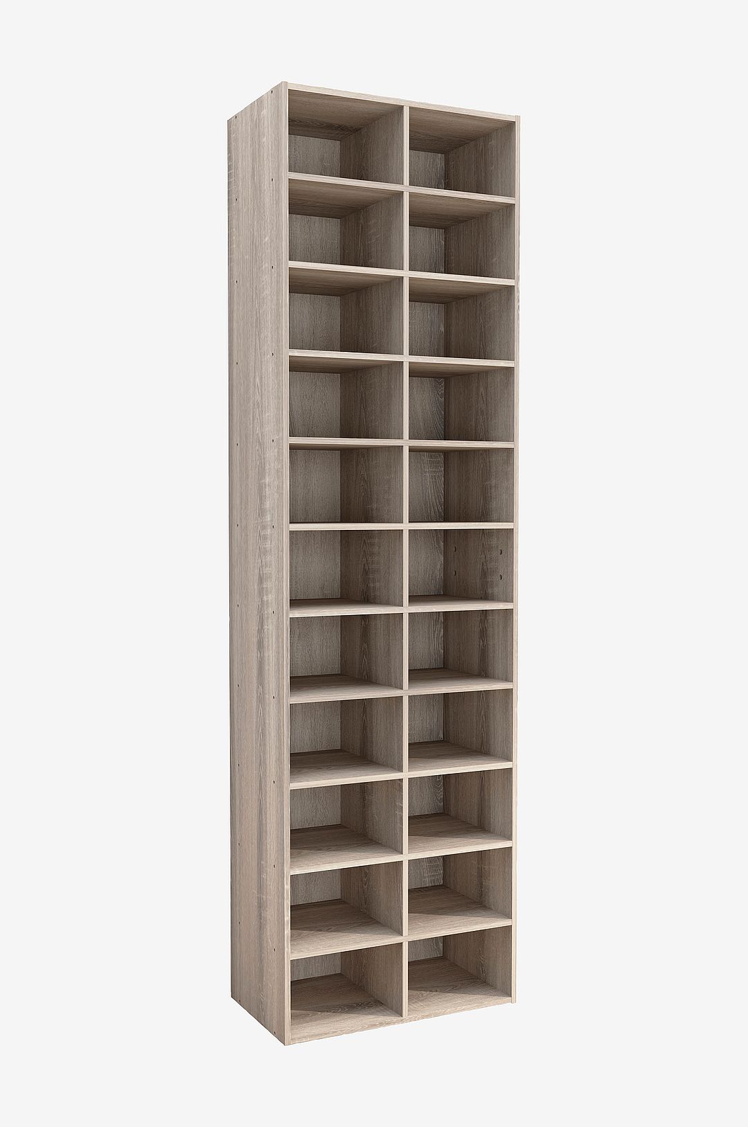 Höjdpunkter: – beslag av högkvalitativ metall – 22 fack för upp till 22 par skor – mått på möbeln: ca H. 183 x B. 52 x D. 30 cm Skoskåpet ”hinsol” är ett mirakel för små utrymmen. Denna möbel erbjuder en kombination av förvaringsutrymme och dekoration som ingen annan. 22 fack ger ett prydligt förvaringsutrymme för 22 par skor eller andra redskap.