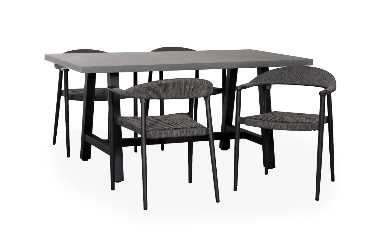 En modern och härlig trädgårdgrupp med fyra stycken stolar från serien Maxton och ett bord från serien Björkvik. Här kan ni njuta av trevliga middagar och fikastunder hela sommaren.Maxton är en modern trädgårdsstol som är nätt och trevlig. Benen av aluminium är pulverlackerade för att skydda mot rost och slitage och den vävda sitsen är tillverkad av det tåliga och väderbeständiga materialet olefin. Detta är alltså en mycket hållbar stol som kommer tjäna dig länge.Björkvik trädgårdsbord är ett smidigt och stilrent bord med grå bordskiva som ger en känsla av betong och med svart underrede som snyggt bryter av. Bordet är av aluminium med en printad bordskiva som ger en snygg finish samtidigt som bordet blir enkelt att hålla rent och lätt att flytta på. Stolen levereras monterad och bordet omonterad.