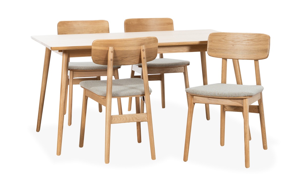 Förnya din matplats med vår tjusiga matgrupp Blanca 150/Lino. Blanca matbord är en vacker möbel i ek och ekfanér som utstrålar en tidlös stil och kvalitet. Bordet har raka, lätt sluttande ben och har plats för iläggsskiva på bordets kant. Lino är en snygg och bekväm matstol i massiv ek. Stolen är designad med en sits i brunt konstläder vilket ger en mjuk sittkomfort.Design & egenskaperVackert matbord i klassisk design med dimensionerna 150x90x75 cm.Har plats för upp till två iläggsskivor som förlänger bordet med 45 cm på vardera sida. Notera att iläggsskivorna säljes separat.Höjd från golv till underkant av bordsskiva: 73 cm.Bredd mellan bordsben långsida: 141 cm.Bredd mellan bordsben kortsida: 81 cm.Totala längden på bordet blir 240 cm (150+45+45 cm) med två iläggskivor. Snygga och bekväma matstolar. Material & skötselBordet är tillverkat i ek och ekfanér.Ytan på bordet är behandlad med en MAT PU-lack med 10% glans.Använd inte rengöringsmedel, skurkrämer eller polermedel på lackerade ytor.För tillfällig rengöring/borttagning av fläckar kan en mjuk trasa fuktad i en mild tvållösning (med t.ex. diskmedel) användas. Torka därefter med en torr trasa eftersom fuktrester kan skada ytan på lång sikt.Eventuellt spill bör avlägsnas så fort som möjligt med en torr eller lätt fuktad trasa.Trä är ett naturmaterial. Ådror och kvistar är en del av träets natur och träets färger och strukturer är naturliga egenskaper.Färgvariationer kan inte undvikas vid normal användning, men för att minimera missfärgning rekommenderar vi att du skyddar träet från direkt solljus.Maxvikt på bordet: 40 kg.Stolarna är tillverkade i massiv ek, tyg av 100% polyester.Maxvikt på en stol: 110 kg.Leverans & förpackningBordet och stolarna levereras omonterade.Antal förpackningar: 3 st