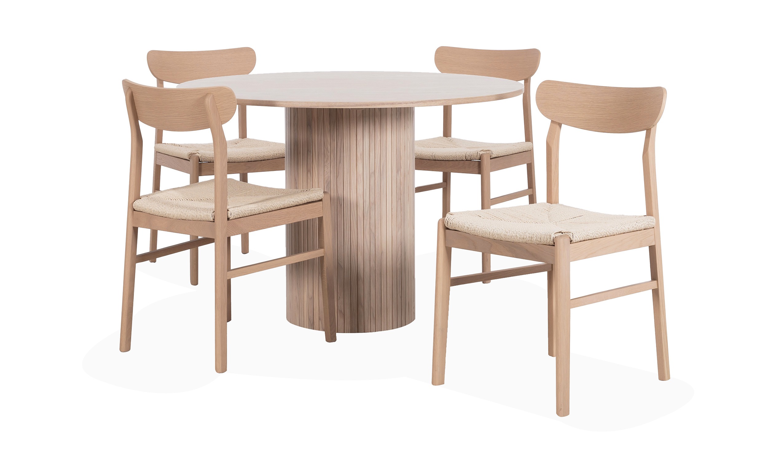 Elsa/Juno är en stilsäker matgrupp som lyfter matplatsen. Elsa är ett modernt och stilsäkert matbord. Bordet är tillverkat i MDF och askfanér och har ett snyggt ribbat underrede som ger en känsla av lyx. Låt matbordet bli en iögonfallande mittpunkt till din matplats som du har glädje av i många år framöver. Juno Stol Vitoljad är en riktig designklassisker gjord i ek och ekfaner med en sits av rep som enkelt förändrar känslan i ditt hem.Design & egenskaperBlickfågande matgrupp som förvandlar matplatsen.Bordet har dimensionerna D110x75 cm.Vackra stolar med klassiskt uttryck och en sitthöjd på 46 cm.Material & skötselBordet är tillverkat i MDF och askfanér.Trä är ett naturmaterial. Ådror och kvistar är en del av träets natur och träets färger och strukturer är naturliga egenskaper.Färgvariationer kan inte undvikas vid normal användning, men för att minimera missfärgning rekommenderar vi att du skyddar träet från direkt solljus.Stolarna är gjorda i ek och ekfanér med sitsar av rep samt har en vitoljad finish. Eventuellt spill bör avlägsnas med en fuktig trasa.Leverans & förpackningBordet levereras omonterat och stolarna levereras monterade.Antal förpackningar: 4 stVikt: 50,4 kg (sammanlagt för två av förpackningarna) / 13,3 kg 2 st