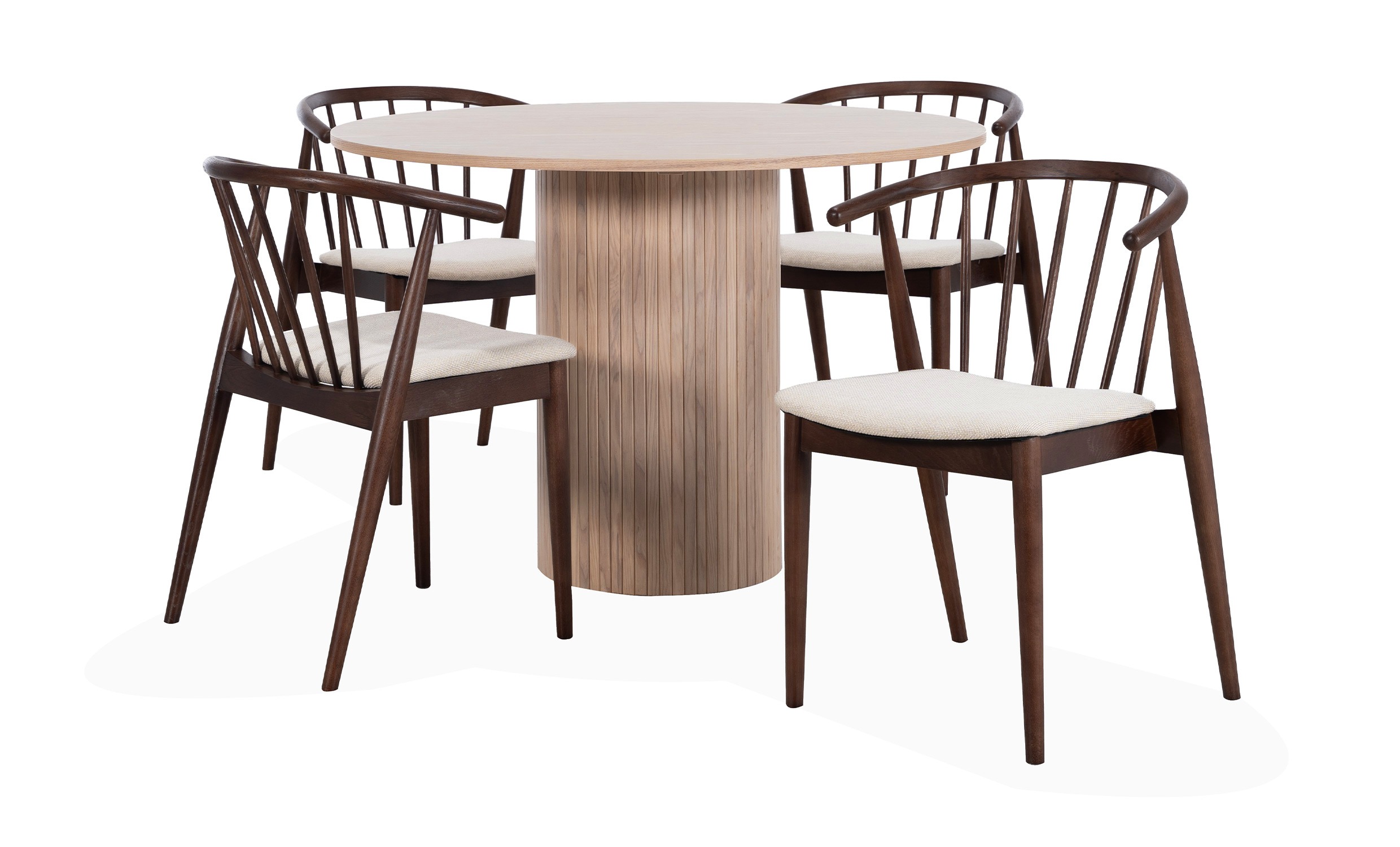 Elsa/Vanja är en fantastisk matgrupp som förändrar matplatsen. Elsa är ett modernt och stilsäkert matbord. Bordet är tillverkat i MDF och askfanér och har ett snyggt ribbat underrede som ger en känsla av lyx. Låt matbordet bli en iögonfallande mittpunkt till din matplats som du har glädje av i många år framöver. Vanja Stol Brun är en härlig stol gjord i böjträ och ek med en sits av tyg som tillför en klassisk känsla i hemmet.Design & egenskaperBlickfågande matgrupp som förvandlar matplatsen.Bordet har dimensionerna D110x75 cm.Vackra stolar med klassiskt uttryck och en sitthöjd på 44,5 cm.Material & skötselBordet är tillverkat i MDF och askfanér.Trä är ett naturmaterial. Ådror och kvistar är en del av träets natur och träets färger och strukturer är naturliga egenskaper.Färgvariationer kan inte undvikas vid normal användning, men för att minimera missfärgning rekommenderar vi att du skyddar träet från direkt solljus.Gjord i böjträ och ek med en sits av tyg.Eventuellt spill bör avlägsnas med en fuktig trasa. Användning av textilrengöring och textilskydd rekommenderas till tygsitsen.Leverans & förpackningBordet levereras omonterat och stolarna levereras monterade.Antal förpackningar: 4 stVikt: 50,4 kg (sammanlagt för två av förpackningarna) / 13 kg 2 st