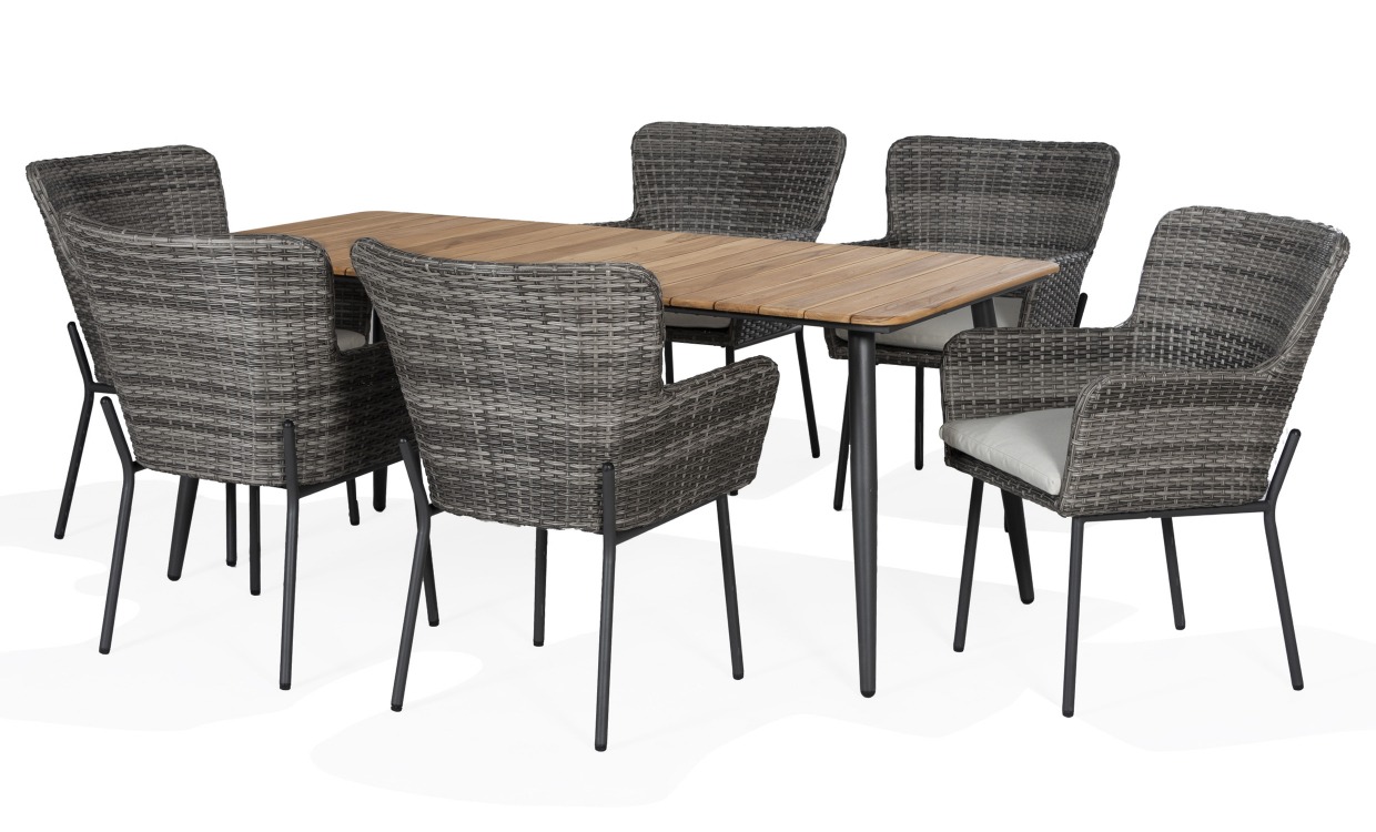 Madrid matgrupp är en kombination av möbler i snygg och klassisk design gjord i konstrotting. Detta är den utmärkta samlingspunkten för långa och härliga måltider i trädgården eller uteplatsen. Benen på stolarna och bordet är i pulverlackerad aluminium. Dynan på stolarna är klädda i ett tyg av polyester. Design & egenskaperMatgrupp i snygg och klassisk design.Levereras med sex stolar och ett bord.Sittdynor ingår.Material & skötselBordsskiva i teak.Behandla gärna bordsskivan med ett tunt lager teakolja då och då. Behandlas materialet ej blir teaken grå med åren – det är en smaksak.Benen på stolarna och bordet är i pulverlackerad aluminium.Stolarna har en flätad yta av konstrotting.Dynornas klädsel är av 100% polyester.Klädseln är vattenavvisande, avtagbar och kan handtvättas.Vi rekommenderar användning av möbelskydd för att förlänga livslängden på möblerna.Leverans & förpackningStolarna och bordet levereras omonterade.Antal förpackningar: 4 stFörpackningsmått: 70x64x66 cm 3 st / 183x12x95 cmVikt: 17,5 kg 3 st / 35 kg