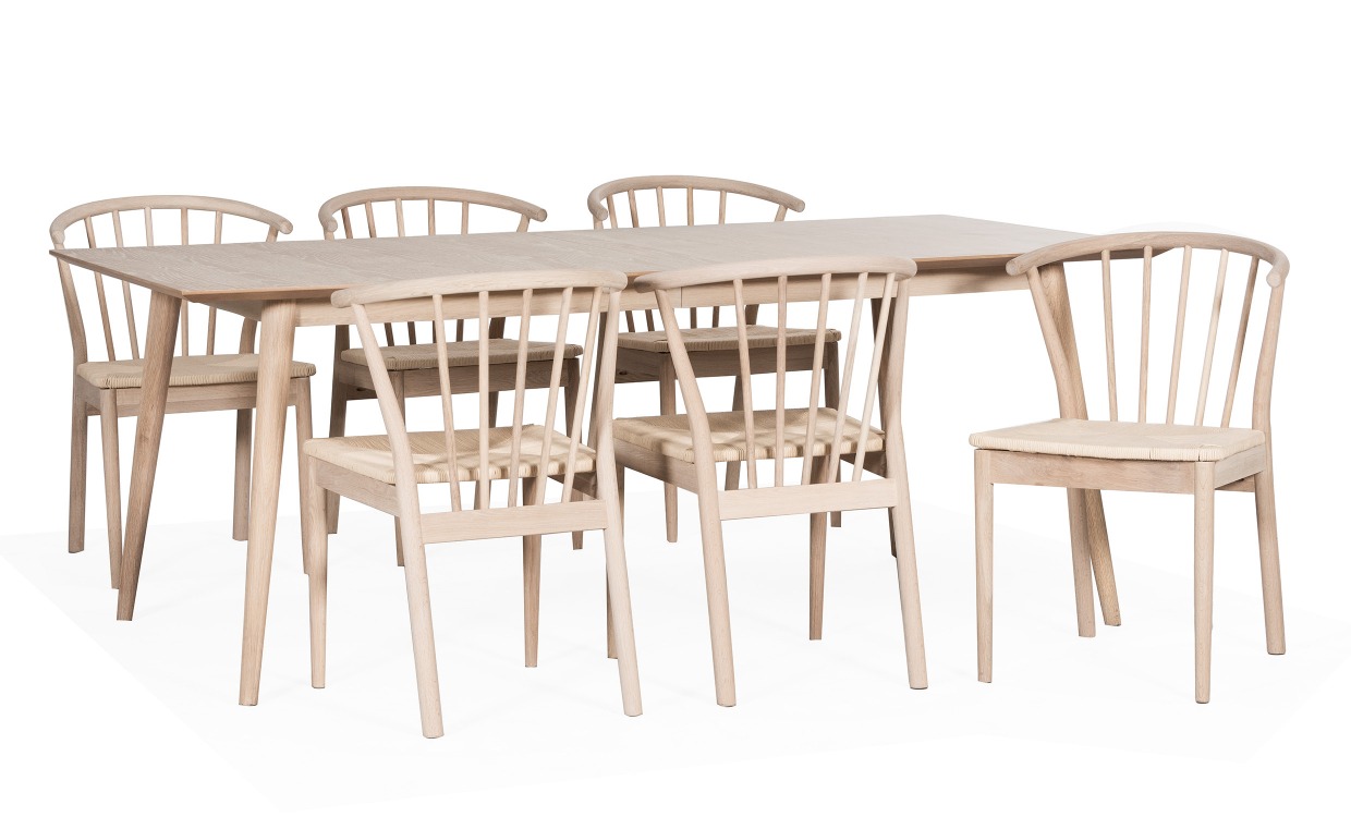 Mads/Ninni matgrupp är det bästa från förr i en modern tappning. Bordet Mads har med sina raka, lätt sluttande ben och plats för en iläggsskiva, en stilren modern design som flörtar med 60-talet. Materialet är helt i ek som har behandlats med vitpigmenterad olja vilket gör bordet ljust och fint. Ninni är en stol har en stomme av ek som oljats vit. Ryggen är kurvad och ger den klassiska pinnstolen en modern känsla tillsammans med den flätade sitsen av rep. Design & egenskaperVackert matbord i klassisk design.Behandlat med vitpigmenterad olja vilket ger bordet ljust och fint.Har plats för en iläggsskiva. Under bordskivan finns även förvaring för iläggskivan som säljs separat.Elegant stol med god komfort och välvda detaljer.Stolens sits är tillverkad av rep som flätats till ett vackert mönster.Stommen är av ek som oljats vit.Maxvikt för stolen: 110 kg.Material & skötselUnderrede tillverkat i massiv ek, bordsskiva tillverkad i ekfaner.Vi rekommenderar att matbordet oljas in vid ankomst samt vid behov.Trä är ett naturmaterial. Ådror och kvistar är en del av träets natur och träets färger och strukturer är naturliga egenskaper.Färgvariationer kan inte undvikas vid normal användning, men för att minimera missfärgning rekommenderar vi att du skyddar träet från direkt solljus.Eventuellt spill bör avlägsnas med en fuktig trasa.Leverans & förpackningBordet levereras delvis monterad och stolarna levereras monterade. Antal förpackningar: 4 stFörpackningsmått: 107,5×207,5×15 cm / 58x95x75 cm 3 st, stolarna kommer i 2-pack.Vikt: 59 kg / 8,2 kg 3 st Notera att iläggsskiva säljs separat.