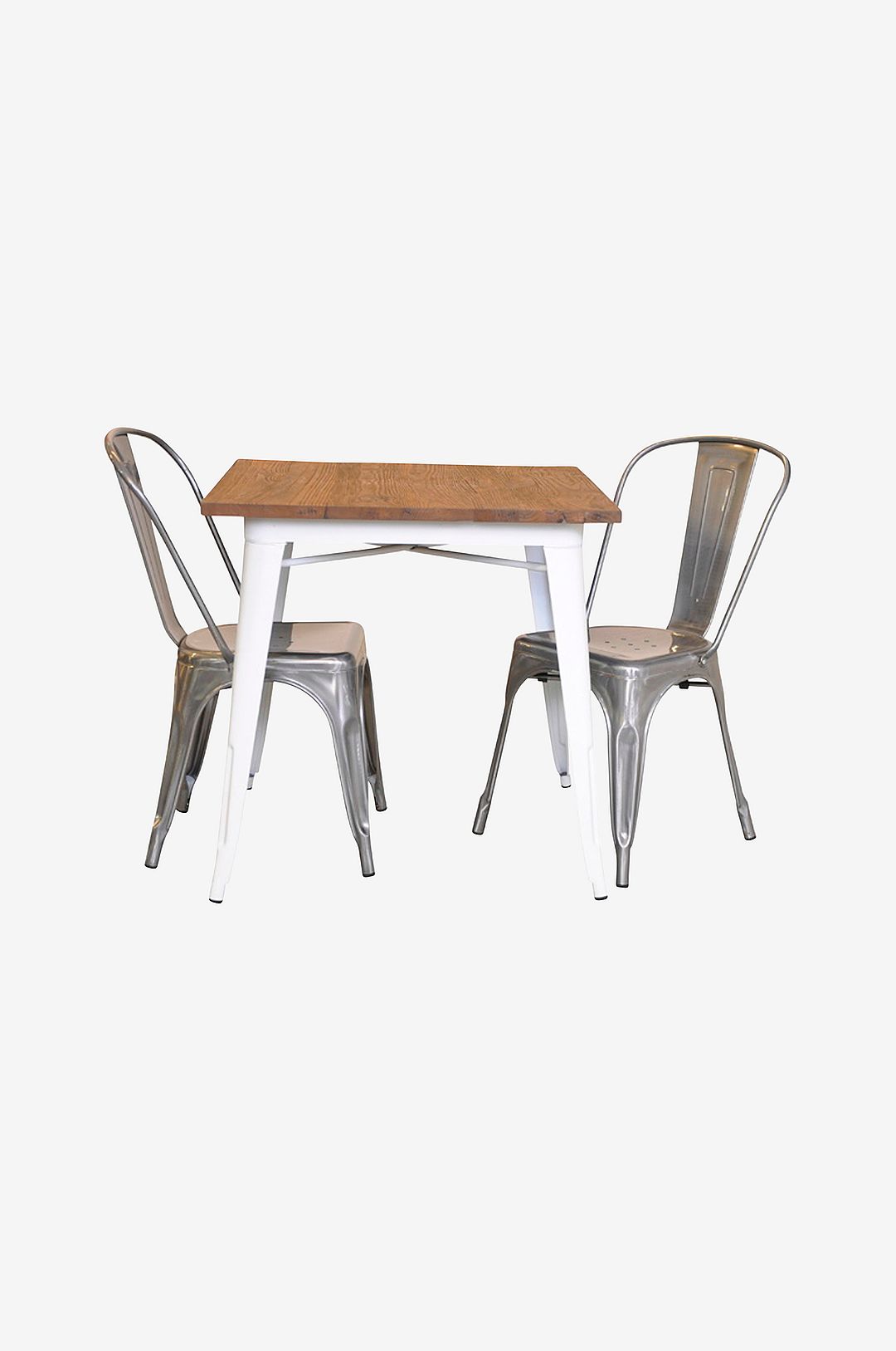 Detta franskinspirerade set består av ett bord med en skiva i rustikt, grovt utförande. Detta inkluderar 2 metallstolar. produktinformation: bord; längd; 75cm bredd; 75cm höjd; 75cm stol; bredd; 45cm djup; 52cm höjd; 82,5cm
