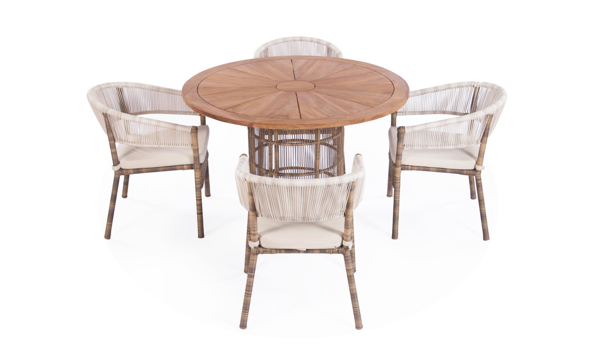 Tijuana är en oerhört vacker trädgårdsgrupp och den perfekta samlingspunkten för härligt umgänge och goda måltider. Bordet och stolarna är gjorda i aluminium och har en flätad yta i konstrotting. Bordsskivan är i naturmaterialet teak. Konstrottingen och teaken ger möblerna dess naturnära och bohemiska inslag. Tijuana är definitivt en blickfångare i matplatsen i trädgården, på altanen eller i uterummet.Design & egenskaperVackra stolar och bord i naturnära och bohemisk design.Fyra stolar och ett bord ingår.Sittdynor ingår.Material & skötselStolar och bord gjorda i aluminium med en yta i flätad konstrotting.Bordsskiva i naturmaterialet teak.Behandla gärna möbeln med ett tunt lager teakolja då och då. Behandlas materialet ej blir teaken grå med åren – det är en smaksak.Dynans klädsel är av 100% olefin, vattenavvisande, avtagbar och kan handtvättas i trettio grader.Vi rekommenderar användning av möbelskydd för att förlänga livslängden.Leverans & förpackningStolarna levereras monterade och bordet levereras i två delar.Antal förpackningar: 6 stFörpackningsmått: 61x61x79 cm 4 st / 125x10x125 cm / 54x54x78 cmVikt: 8,39 kg 4 st / 19,07 kg / 6,67 kg
