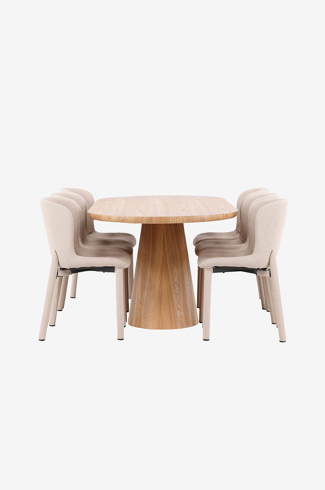 Upplev den perfekta kombinationen av stil, komfort och funktionalitet med matsalsmöblemanget bestående av matbordet Stjärnö och matstolarna Astoria. Denna uppsättning ger en inbjudande och sofistikerad atmosfär till din matsal, där både design och komfort står i centrum. stjärnö matbord har generösa mått (200×90 cm), vilket ger gott om utrymme för både vardagliga måltider och större sammankomster. Bordsskivan, som är tillverkad av mdf, har en fint bearbetad yta som framhäver träets autentiska utseende och skapar en varm och harmonisk känsla. Den praktiska och hållbara designen gör bordet lätt att underhålla och perfekt för daglig användning. Den släta ytan gör bordet lätt att rengöra, medan den robusta konstruktionen garanterar stabilitet, oavsett hur många gäster du har. Astoria-matstolen, klädd i mjuk, strukturerad bouclé, kompletterar bordet på ett elegant sätt. Det raffinerade tyget ger stolen en lyxig och inbjudande känsla som smälter in vackert i både moderna och klassiska inredningar. Det omslutande ryggstödet och den bekväma sittdynan gör Astoria-stolen till den perfekta platsen för långa, avkopplande måltider med familj och vänner. Med sin tidlösa design blir den här stolen en naturlig fokuspunkt i din matsal och tillför både elegans och komfort. Tillsammans skapar matbordet Stjärnö och matstolarna Astoria en harmonisk och funktionell helhet, där varje måltid blir en lyxig upplevelse i en inbjudande miljö.