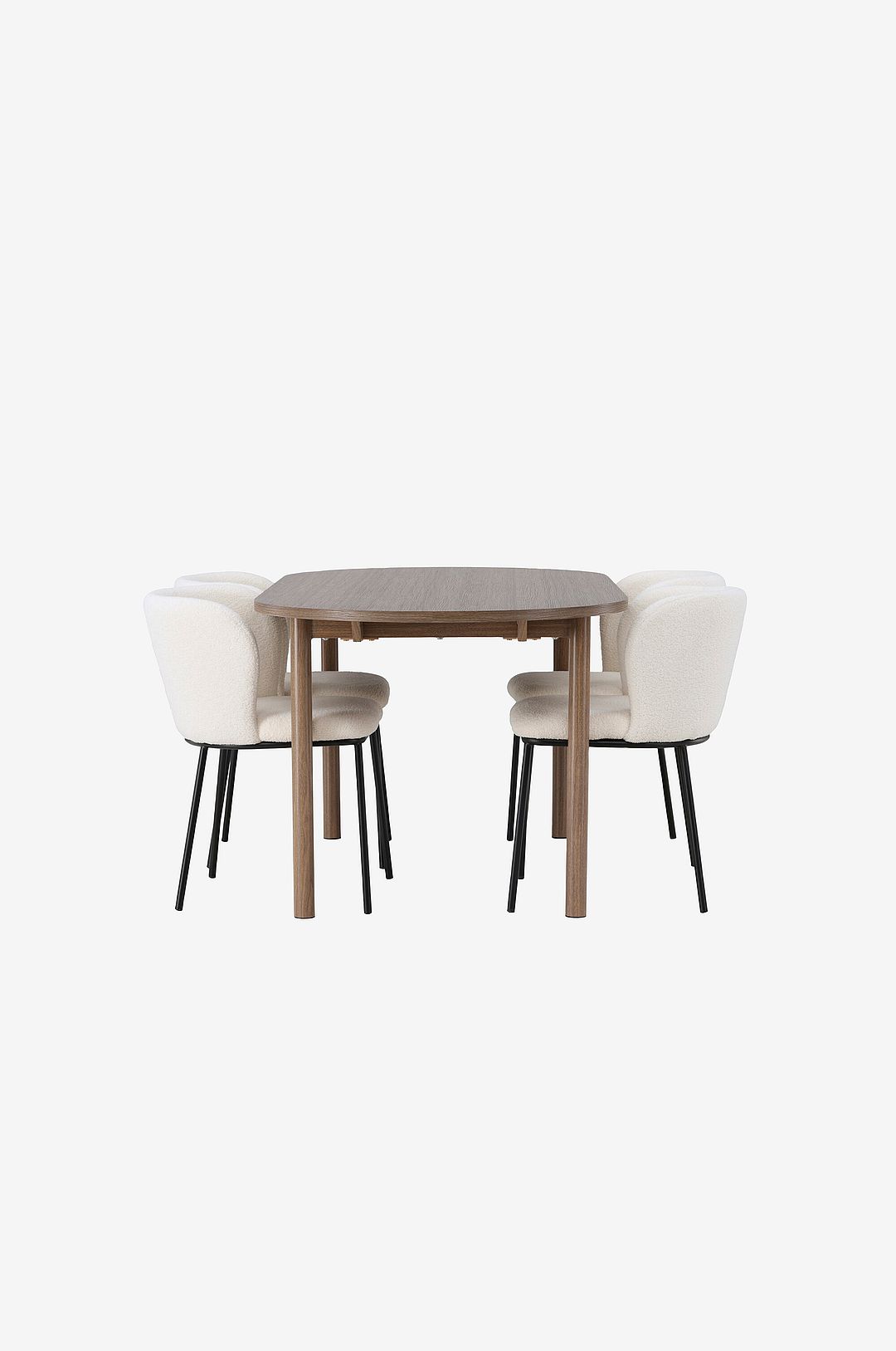 Det blir knappt med stilrent och charmigt än såhär. Den här matgruppen kombinerar de bästa trenderna just nu med sin skandinaviska stil, mjuka former och hållbara material! det ovala matbord andy kombinerar stilrenhet och charm på bästa sätt. Den tunna toppskivan tillverkad av mdf och de cylinderformade benen ger en luftig känsla till rummet. Med sin genomgående färg är det enkelt att matcha matbordet med din övriga inredning och skapa en harmonisk atmosfär. Här matchas matbordet med stilrena matstolar från serien edina. Stolen har en följsam och helklädd sits i boucletyg, vilket ger en lyxig känsla till din matplats. De minimalistiska stolsbenen i metall kompletterar den stilrena designen på ett elegant sätt. här sitter du kvar länge och njuter av smarriga måltider med familj och vänner. Inred ditt hem med dessa fantastiska möbler och njut av en matgrupp som verkligen kommer att imponera på dina gäster!
