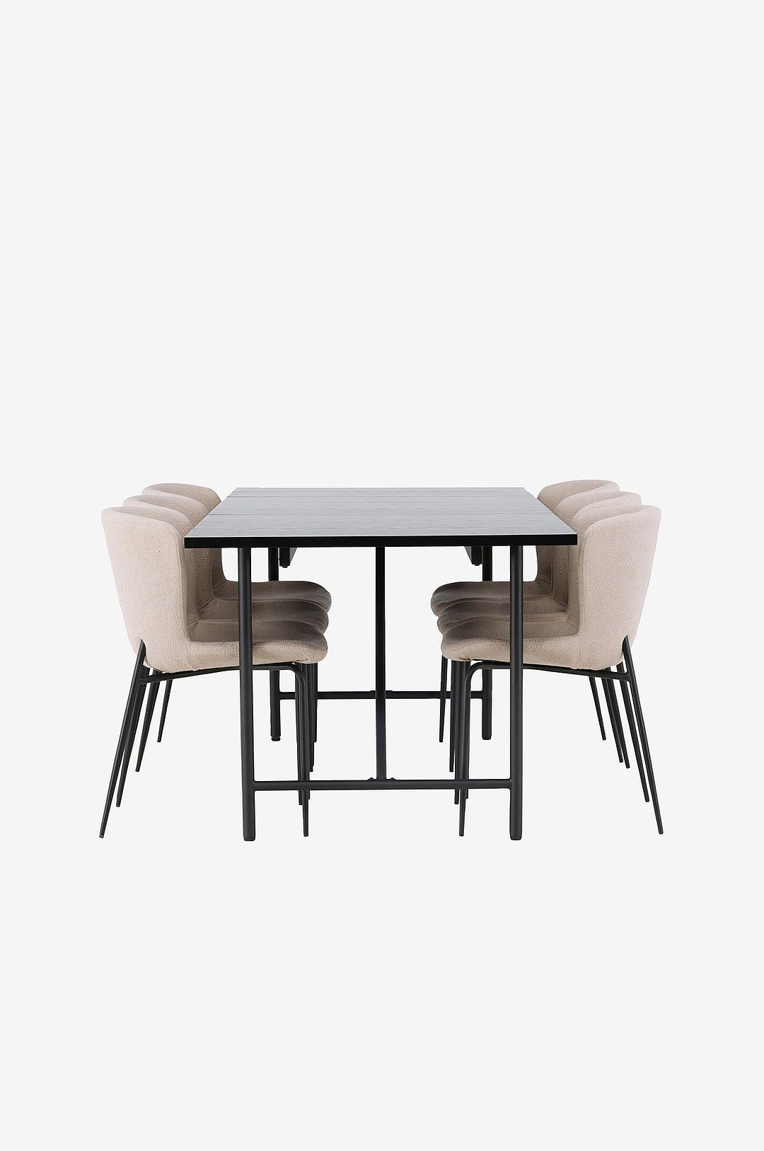 Här får du en färdigkomponerad matgrupp som är genomtänkt och enkel att matcha med din personliga inredningsstil. Det ska kännas enkelt att inreda hemmets hjärta charmigt och med en stilfull touch! det vackra matbord astrid kommer verkligen att ta din inredning till nästa nivå. Med sin rektangulära, tunna mdf-skiva med faner ger astrid en sofistikerad känsla till ditt rum. Underredet är smalt och skapar snabbt en luftig atmosfär som öppnar upp rummet. Storleken är dessutom generös och rymmer plats för både familj och vänner. Här kombineras matbordet med matstolarna från serien modesto för att skapa den perfekta harmonin i ditt hem. Med sin skandinaviska design ger dessa stolar en inbjudande atmosfär till ditt hjärta. Den mjuka boucleklädseln ger en bekväm och mysig känsla, medan de stilrena, smala stolsbenen i svart metall ger en modern touch. stolens lätt rundade rygg och stoppade sittdyna ger extra komfort, så du kan sitta bekvämt under långa måltider eller samtal med vänner. Med matgruppen astrid och modesto får du inte bara en praktisk och elegant lösning för din matsal, utan också en känsla av lyx och stil! Vad mer kan man tänkas behöva?