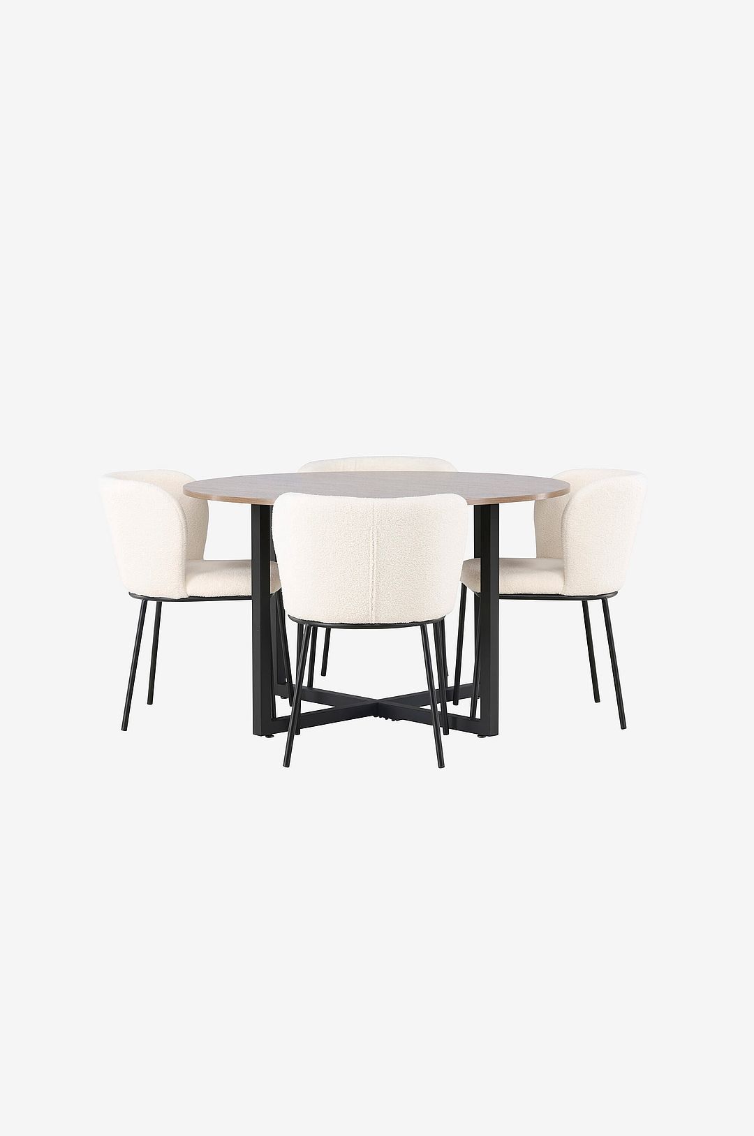 Inred lika lyxigt som charmigt med en oemotståndlig matgrupp som kombinerar stil och komfort på ett helt unikt sätt! det runda matbord durango har en tidlös design med en bordsskivan i mdf och raka ben som smälter samman i ett kryss nära golvet. Oavsett om du bjuder in till familjemiddagar eller festliga tillställningar kommer durango att vara den perfekta platsen att samla dina nära och kära. för att komplettera matbordet matchas det här med de stilrena matstolarna edina. Stolens minimalistiska stolsben i metall ger en sofistikerad touch till helhetsintrycket. Stolens sittplats är helklädd i boucletyg, vilket ger både komfort och en elegant finish. Den följsamma designen ger dig en bekväm stol där du kan sitta och njuta av långa måltider eller engagerade samtal. med bordet durango och stolarna edina höjer du inte bara stilnivån i ditt hem, du skapar också en trivsam mittpunkt i hemmets hjärta. Låt samtal och skratt flöda fritt här där ingen riskerar hamna på kanten!