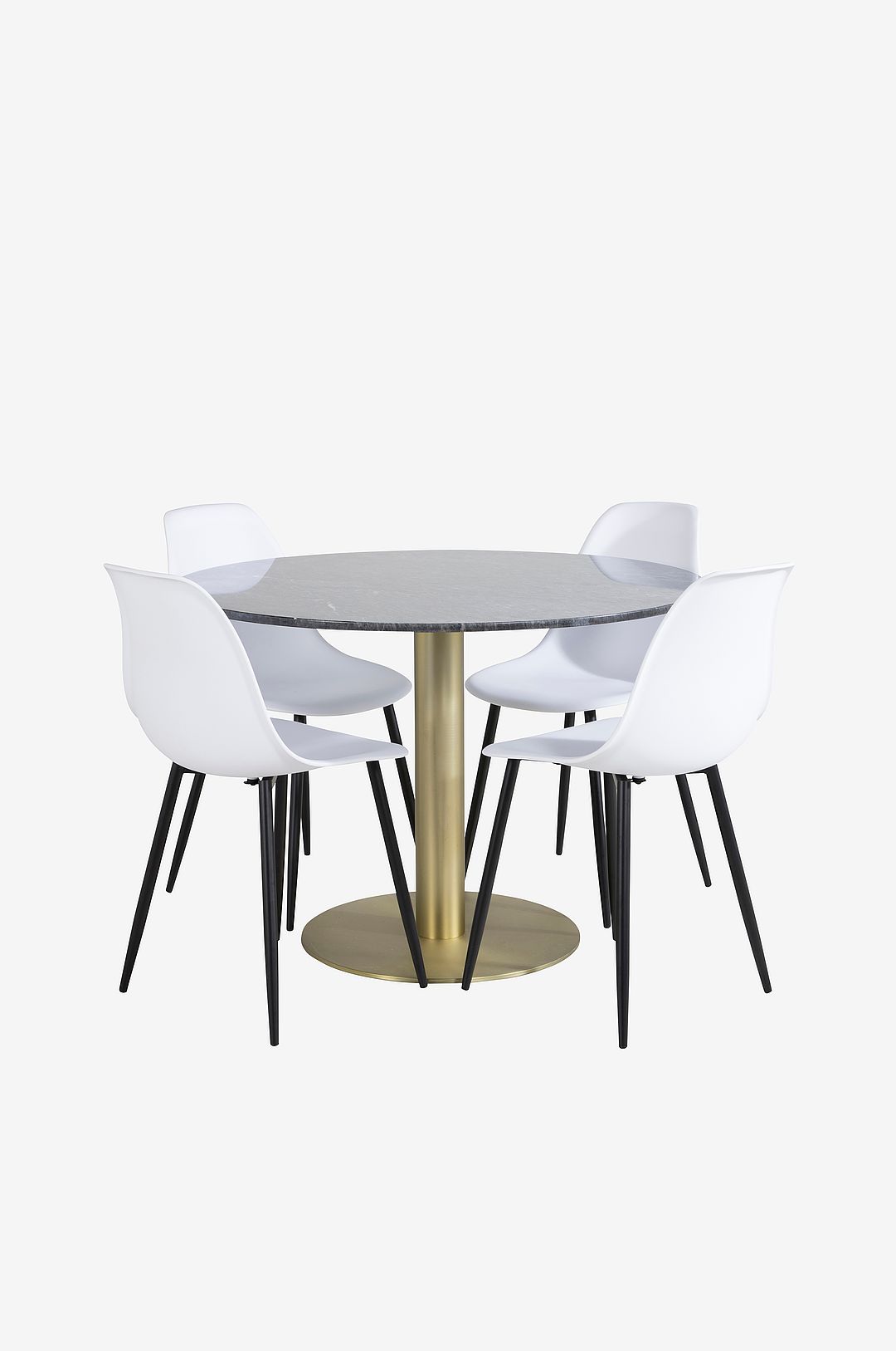 Estri matbord med en rund topp i marmor och bordsben i metall . Matchas med 4st Penally klädda matstolar och stolsben i metall med snurrfunktion. Bord och stol kräver enklare montering. Bordets mått: Diameter: 106cm, Höjd: 75cm. Stolens mått: Sittdjup: 39cm, Sittbredd: 44cm, Sitthöjd: 48cm.