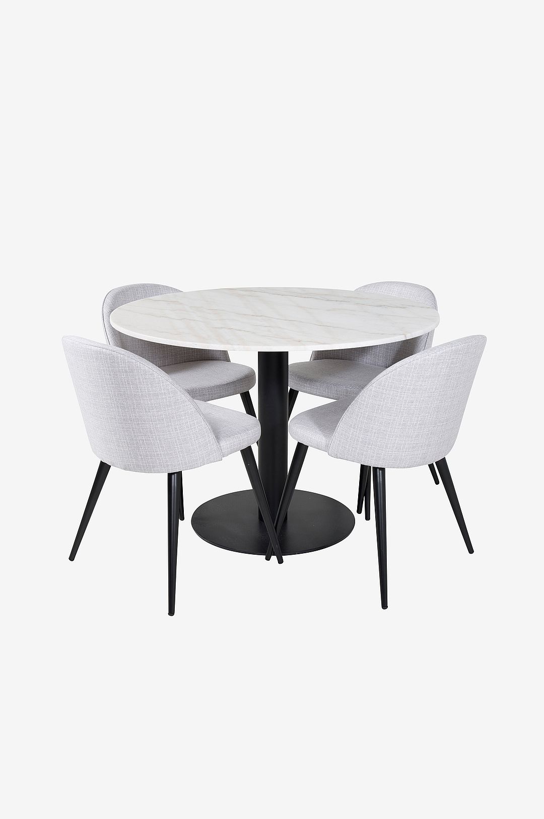 Estri matbord med en rund topp i marmor och bordsben i metall. Matchas med 4st Valleta matstolar med stolsits i polyester och stolsben i metall. Bord och stol kräver enklare montering. Bordets mått: Diameter: 106cm, Höjd: 75cm. Stolens mått: Sitthöjd: 46,5cm, Sittdjup: 42,5cm, Sittbredd: 41.