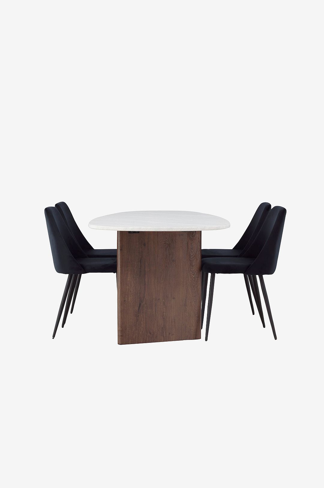 Matgruppen som tar din inredning till nya höjder med sin skandinaviska design och enastående utformning. Den här matgruppen har du drömt om, och det kommer snabbt bli blickfånget i ditt hem! det ovala matbord grönvik har en oregelbunden bordsskiva i mdf med betong-look som ger en unik touch till din inredning. De tunna träskivorna i trendig kulör som bär upp bordet ger det en elegant och stabil touch. Med det här bordet skapar du snabbt en miljö som andas stil och charm. Här har vi matchat matbordet med matstolar från serien night. Med sina helklädda sitsar i svart sammetstyg och matchande svarta stolsben, tillför night en känsla av lyx och exklusivitet till ditt vardagsrum. Varje måltid blir en fest! en underbar kombination av stil och komfort helt enkelt. Grönvik och night tillsammans skapar en inbjudande och modemedveten atmosfär som får ditt hem att kännas som en exklusiv plats. Oavsett om det är en festlig middag eller en mysig brunch, kommer grönvik och night att få dig att känna dig stolt över ditt val av matgrupp!
