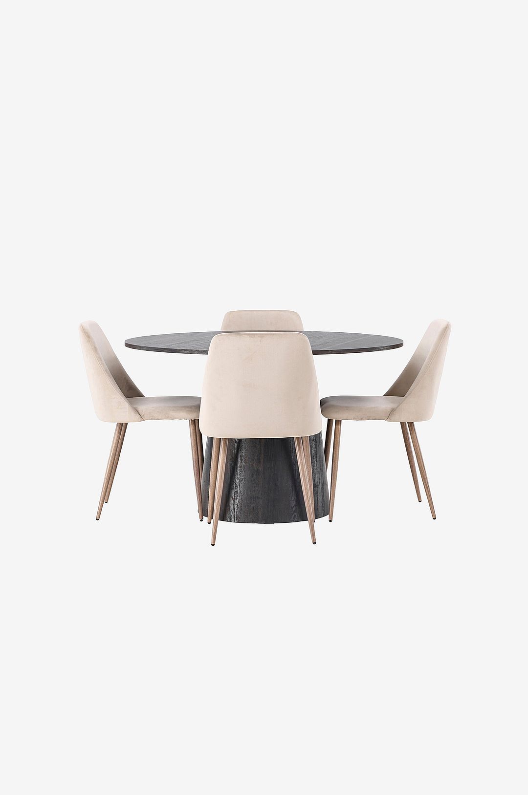 Varma toner och charmig design! Venture designst underbara, runda matbord lanzo har en genomgående helhetsdesign i mdf med en tunn toppskiva och en vriden cylinderformad stomme som är centrerad under bordets mitt. Här tillsammans med matstolar från serien night. Stolen har en helklädd sits i sammetstyg och stolsben i stål. En fantastisk matgrupp helt enkelt!