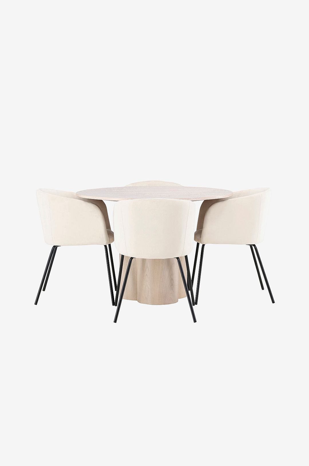 En ljus matgrupp som höjer den trivsamma atmosfären i hemmet! Det runda matbordet olivia imponerar med sin skandinaviska design. Bordet har en genomgående helhetsdesign i putsad mdf med en tunn, rund toppskiva och tre cylinderformade ben som sitter samlat under bordets mitt. Här tillsammans med pampiga matstolar berit. Stolen har en helklädd design med lätt rundad rygg och sits i sammetstyg samt smala stolsben i järn. En underbar kombination helt enkelt! Bordets mått: 110cm.
