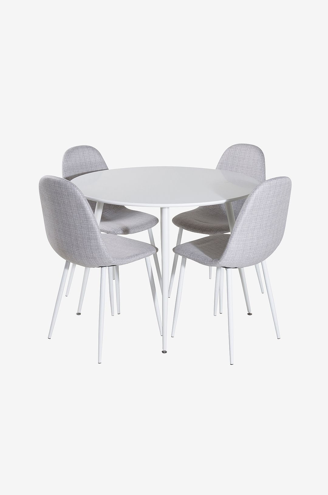 En matgrupp i modern och stilren design. Matbord Plaza och matstolar Polar är perfekta kombinationen till hemmets hjärta, som troligtvis passar lika bra ihop med dina behov som med din övriga inredning. Bord: Material Bordsskiva: MDF Material Bordsben: Stål Diameter: 100 cm Höjd: 75 cm Stol: Material stolsben: Stål Höjd: 87 cm Bredd: 44 cm Djup: 53 cm
