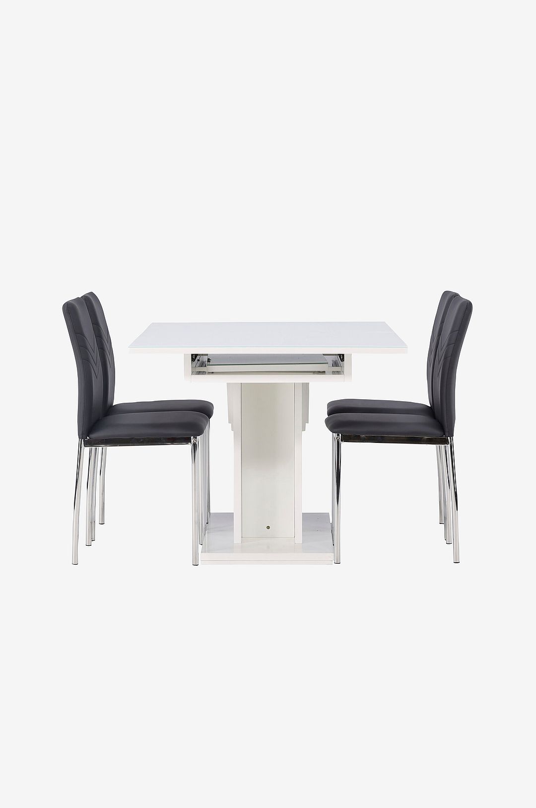 Möblera ditt hem i industriell stil och med smarta funktioner – den här förlängningsbara matgruppen passar perfekt både till vardags och till fest! det smarta matbord pluto har en genomtänkt design. Bordet är konstruerat med omsorg och har en bordsskiva i mdf med en glastopp som ger en sofistikerad touch till rummet. Dess center-placerade underrede ger både stabilitet och en robust känsla. men det är inte allt – detta bord är även förlängningsbart! Så oavsett om du har ett mindre sällskap eller en stor fest på gång, så kan du anpassa pluto efter dina behov. Njut av en flexibel lösning som passar perfekt för både små och stora sammanhang. tillsammans med matbordet pluto kommer matstolar från serien lily, med sin skandinaviska design och tidlösa nordiska former. Dessa stolar är enkla, men ändå otroligt vackra. Dess konstläderklädseln ger en kaxig känsla samtidigt som de kromade stolsbenen ger en industriell. Dekorsömmarna längs ryggstödet lägger till en stilfull detalj – här får du både en pampig matgrupp och en bekväm sittplats till framtida måltider!