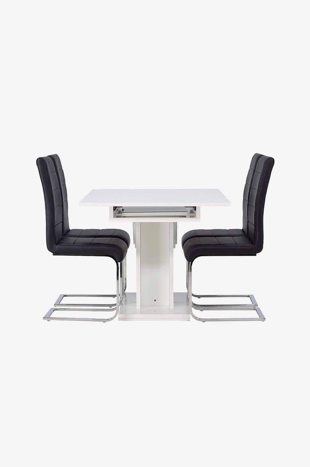 Möblera vardagsrummet modernt och inbjudande med en smart matgrupp som är förlängningsbart vid behov! detta förlängningsbara matbord från serien pluto har en trendig design och hållbar kvalitet. Bordsskivan är i mdf med en glasskiva ovanpå som blir en snygg detalj. Bordets förlängningsbara funktion gör det enkelt att rymma både små och stora sällskap, vilket gör detta bord till en perfekt investering för alla slags tillfällen. Och vad vore ett elegant matbord utan matchande stolar? Därför inkluderas de fantastiska matstolarna tempo. Stolarnas nordiska design och dekorativa stomme kommer att ge din matupplevelse en extra touch av stil. Pu-klädseln tillsammans med de kromade benen skapar en harmonisk kontrast som omedelbart fångar uppmärksamheten. men det är inte bara utseendet som räknas. Tempo matstolar är också otroligt bekväma. Den speciella designen på benen ger en behaglig sviktning och ett skönt gung, vilket ger en extra dimension av komfort till varje måltid. Med dessa stolar kan du luta dig tillbaka och njuta av varje tugga med en känsla av lyx och välbefinnande!