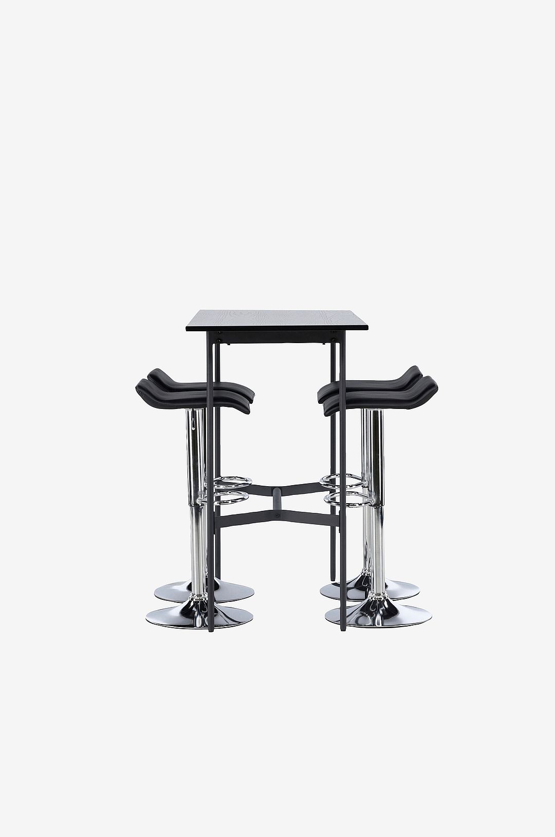 En avskalad bargrupp med trendig design! Det minimalistiska barbordet rax har en tunn bordsskiva i mdf och smala bordsben med integrerat fotstöd i metall. Här i kombination med barstolar från serien jonna. Stolen har en stilsäker design med en trumpetfot i kromat stål och en enkel sits i konstläder. Ta din inredning till nya höjder!
