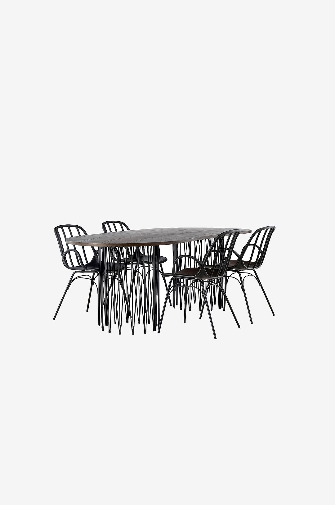 Skapa en personlig känsla i vardagsrummet! Vårt ovala matbordet stone imponerar med sin modemedvetna design. Bordet har en vacker bordsskiva i mdf med faner och två dekorativa cylinderformade stommar i metall. Här tillsammans med 4st matstolar från serien dyrön. Stolen är lika stilren som praktisk, tillverkad i plast och stål. Sitsen har integrerade armstöd och en ribbad design i den lätt rundade ryggen. Lika tålig som stilren!