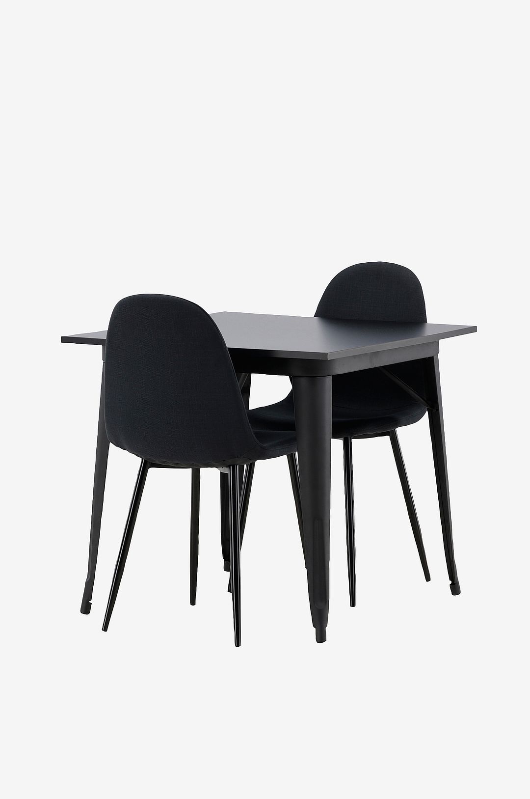 En charmig matgrupp för två – perfekt för det lilla köket! Det här matbordet från serien Tempe har en klassisk, kvadratisk utformning och en tidlös svart kulör. Bordsskivan är i svart MDF och bordsbenen i svart metall. Här i smakfull kombination med två matstolar från serien Polar i sotig nyans. Stolen har en helklädd design med en rundad rygg och sits i svart polyestertyg med mjuk stoppning och ben i svart pulverlackerad metall. Slipp kompromissa mellan komfort och design!