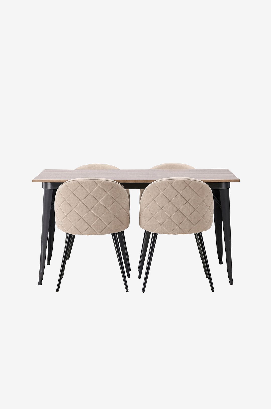 Trendsäkert och genomtänkt! Matbordet från Tempe-serien har en stilren, skandinavisk design. Tillverkat med en kvadratisk bordsskiva i valnötsfärgad Mdf och bordsben i svart metall. Här i trendsäker kombination med matstolar ur serien Velvet Stitches. Stolens rygg är rundad och precis som sitsen är den mjukt klädd i polyesterlinne med dekorativa dekorsömmar och rutmönster på ryggen. Benen är lätt utsvängda i svart järn och ger ett stadigt intryck. Den här matgruppen är lika bekväm som den är inbjudande! Bordets mått: 140x80cm.