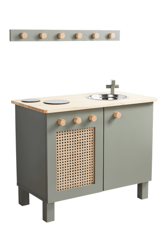 Barnkök i målad MDF med obehandlad bänkskiva i massiv furu och rotting i ena luckan. Köksskåpet har två spisplattor och en diskho med träkran. Båda skåpen är öppningsbara med ett hyllplan i vardera. Till köket hör en knoppbräda med 6 knoppar. Alla knoppar både på skåpet och brädan är av furu. Produkten är CE-märkt vilket innebär att leksaken uppfyller kraven i gällande EU-lagstiftning. Rekommenderas från 3 års ålder och uppåt. Levereras omonterat. Monteringsanvisning medföljer. Material: Furu, MDF och rotting. Storlek: Höjd 62,8 cm, bredd 68 cm, djup 37 cm. Frihöjd under möbel 10 cm. Skötselråd: Torkas av med lätt fuktad trasa.