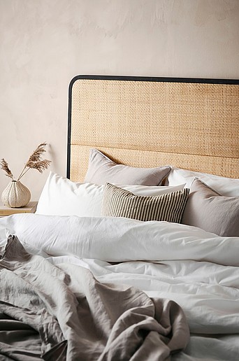 Sänggavel av vitsåpad ek eller matt, svartlackad bok och rotting. De rundade hörnen ger en modern känsla och sänggavlen förnyar ditt sovrum utan att du behöver byta hela sängen. Baksidan av sänggaveln är av plywood och bakom rottingen finns ett mellanlägg av skumgummi. Träblock på ramens insida är av björk. Rotting är ett naturmaterial och kan därför skifta i färg från möbel till möbel. Du kan även behöva klippa bort mindre uppstickande fibrer allteftersom möbeln används. Undvik att placera möbeln nära element, kamin eller andra värmekällor eftersom det kan göra att materialet torkar ut och försvagas. Sänggaveln monteras mot väggen bakom din resårmadrass eller kläms fast mellan väggen och sängen. Väggfäste medföljer. Material: Ek eller bok, björk, rotting, plywood, skumgummi, non woven. Storlek: Bredd 165 cm, höjd 78 cm, djup 3,5 cm. Skötselråd: Torkas av med lätt fuktad trasa. Formgivare: Jotex Design Studio.