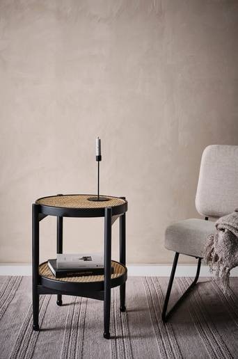 Litet, runt sidobord med bordsskiva av rotting. Ramen runt bordsskivan och benen är av ljust almträ eller svartmålad björk. Material: Trä och rotting. Storlek: Höjd 55,5 cm, ø 48 cm. Avstånd mellan hyllplan: 27 cm. Skötselråd: Torkas av med lätt fuktad trasa.