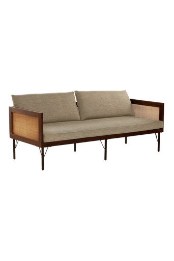Soffa i snygg kombination av mangoträ, rotting och randvävt linnetyg med fin struktur. Armstöden har ram av mörkt mangoträ med rottingsidor. De mjukstoppade ryggkuddarna är lösa medan sittdynan är fast, även den är mjukstoppad. En snygg soffa som ger ett nätt intryck. Material: Mangoträ, lin och polyesterstoppning. Storlek: Höjd 65 cm, bredd 180 cm, djup 74 cm. Formgivare: Jotex Design Studio. Tips/råd: VANCOUVER finns även som fåtölj. Soffa och fåtöljer blir en fin sittgrupp tillsammans.