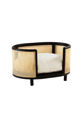 En mysig hundbädd eller kattbädd med tjock dyna, stomme av trä och rotting samt botten av MDF. En perfekt sovplats för din fyrbenta vän. Rotting är ett naturmaterial och kan därför skifta i färg från möbel till möbel. Du kan även behöva klippa bort mindre uppstickande fibrer allteftersom möbeln används. Undvik att placera möbeln nära element, kamin eller andra värmekällor eftersom det kan göra att materialet torkar ut och försvagas. Vid användning utomhus bör möbeln stå skyddat från regn och fukt, som i ett orangeri eller uterum Material: Trä, rotting, tyg: 86% bommul, 15% polyester. Storlek: Höjd 45 cm, bredd 80 cm, djup 56 cm. Skötselråd: Torkas av med lätt fuktad trasa.
