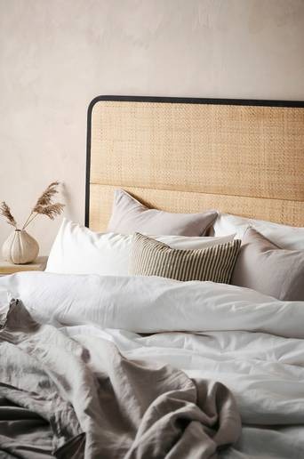 Sänggavel av vitsåpad ek eller matt, svartlackad bok och rotting. De rundade hörnen ger en modern känsla och sänggavlen förnyar ditt sovrum utan att du behöver byta hela sängen. Baksidan av sänggaveln är av plywood och bakom rottingen finns ett mellanlägg av skumgummi. Träblock på ramens insida är av björk. Rotting är ett naturmaterial och kan därför skifta i färg från möbel till möbel. Du kan även behöva klippa bort mindre uppstickande fibrer allteftersom möbeln används. Undvik att placera möbeln nära element, kamin eller andra värmekällor eftersom det kan göra att materialet torkar ut och försvagas. Sänggaveln monteras mot väggen bakom din resårmadrass eller kläms fast mellan väggen och sängen. Väggfäste medföljer. Material: Ek eller bok, björk, rotting, plywood, skumgummi, non woven. Storlek: Bredd 185 cm, höjd 78 cm, djup 3,5 cm. Skötselråd: Torkas av med lätt fuktad trasa. Formgivare: Jotex Design Studio.