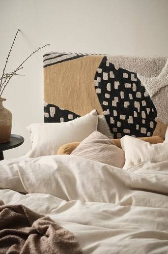 IBEN är en sänggavel klädd med handtuftad matta, som har ett fantastiskt mönster skapat av olika garnfärg, vävteknik och lugghöjd. Stommen är av plywood. Klädseln är ej avtagbar. Den mattklädda sänggaveln är behaglig att sitta och luta sig mot samtidigt som den skyddar väggen bakom sängen som lätt kan bli sliten och ful. Sänggaveln placeras mot väggen bakom din säng eller resårmadrass. Material: Klädsel: Ull, viskos och bomull. Stomme: Plywood. Storlek: Bredd 160 cm, höjd 120 cm, djup 10 cm. Passar en säng/resårbotten som är 160 cm bred. Skötselråd: Dammsugning. Fläckar tas bort med lätt fuktad trasa. Tips/råd: Komplettera med ett nytt överkast och mängder av mjuka kuddar, så får du en säng som är både snygg och bekväm, dygnet runt.