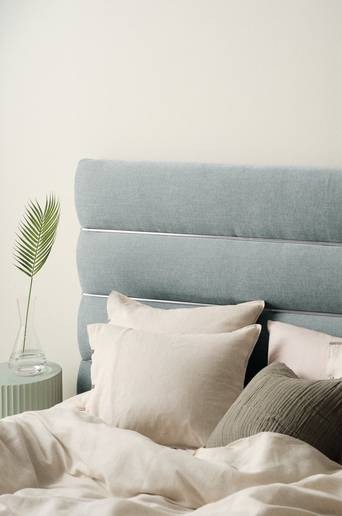 KLIPPHOLMEN är en vadderad sänggavel, klädd med melerat tyg som delas av horisontellt med silverfärgade metallstavar med matt, borstad yta. Tyget är av polyester och 52% kommer från återvunnen polyester. Tyget har mjuk sammetskänsla och hög slitstyrka, Martindale 80000. Stommen är av FSC-märkt furu och plywood som kompletterats med mjuk skumfyllning. Överdraget är ej avtagbart. Den vadderade gaveln är behaglig att sitta och luta sig mot samtidigt som den skyddar väggen bakom sängen. Sänggaveln monteras mot väggen bakom din säng eller resårmadrass. Väggfäste medföljer. Viss montering krävs. Monteringsanvisning medföljer. Produkten är certifierad med FSC vilket innebär att den består av trä som är avverkat från ett ansvarsfullt skogsbruk som tar hänsyn till människor och miljö. Licensnummer & testinstitut: BV-COC-142544 Bureau Veritas. Produkten innehåller återvunnen polyester som är framtagen från rester i produktionen eller från förbrukat material. Gamla resurser får nytt liv istället för att nya resurser förbrukas. Material: Klädsel: 100% polyester. Skum och polyestervadd. Stomme: Furu och plywood. Storlek: Bredd 178 cm, höjd 125 cm, djup 12 cm. Passar en säng/resårbotten som är 160 cm bred. Skötselråd: Dammsugning. Fläckar tas bort med lätt fuktad trasa. Tips/råd: Komplettera med ett nytt överkast och mängder av mjuka kuddar, så får du en säng som är både snygg och bekväm, dygnet runt.