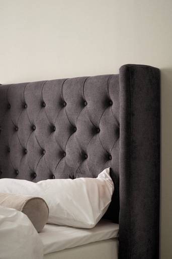 Fristående sänggavel klädd med ett enfärgat tyg som är mjukt och behagligt. Sänggaveln har vingar framåt och de djuphäftade, klädda knapparna ger en lyxig känsla. Stommen är av plywood och massivt trä som vadderats med skumgummifyllning. Väggfäste ingår, en ramp på baksidan gör det enkelt att hänga upp gaveln om du vill det. Du kan också klämma fast sänggaveln mellan sängen och väggen. Viss monterings krävs. Monteringsanvisning medföljer. Vill du känna på klädselns kvalité och se om färgen passar perfekt hemma hos dig? Beställ tygprov så kan du fundera i lugn och ro. Tyget heter ENJOY med artikelnummer: 1768649 (skriv i sökfältet). Material: Tyg: 93% polyester och 7% polyamid. Stomme: Plywood och trä. Fyllning: Skum. Storlek: Bredd 137 cm. Höjd 121 cm. Djup 28 cm. Sängbredd 120 cm. Skötselråd: Dammsugning. Fläckar tas bort med lätt fuktad trasa. Tips/råd: Komplettera med ett matchande överkast och mjuka sköna kuddar så blir hela sängen som ny.