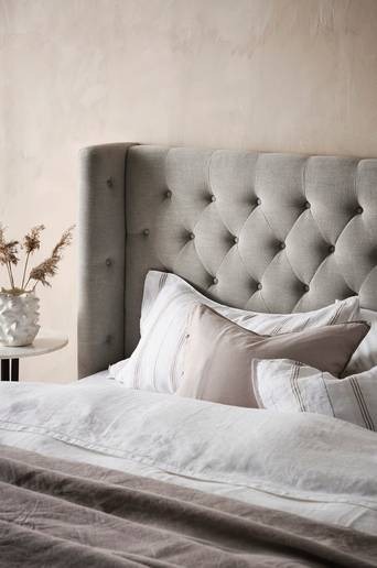 Fristående gavel klädd med linne och djuphäftade klädda knappar. Går även att hänga upp på väggen. Skapa lyxig hotellkänsla hemma med en djuphäftad sänggavel med vingar. Material: Linnemix (70% viskos, 30% lin), trästomme och skumgummifyllning. Storlek: Gavelbredd 190 cm. Sängbredd 180 cm. Höjd 122 cm. Djup 10 cm. Skötselråd: Torkas med fuktig trasa. Tips/Råd: Förutom bekvämt stöd för ryggen får du ett mjukare intryck med en stoppad sänggavel. Väggfästen medföljer.
