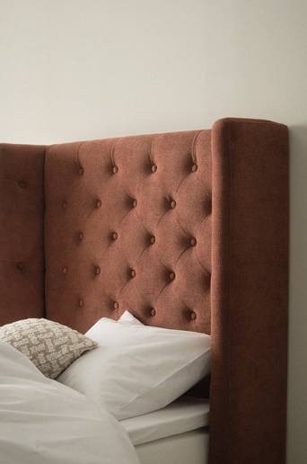Fristående sänggavel klädd med ett enfärgat tyg som är mjukt och behagligt. Sänggaveln har vingar framåt och de djuphäftade, klädda knapparna ger en lyxig känsla. Stommen är av plywood och massivt trä som vadderats med skumgummifyllning. Väggfäste ingår, en ramp på baksidan gör det enkelt att hänga upp gaveln om du vill det. Du kan också klämma fast sänggaveln mellan sängen och väggen. Viss monterings krävs. Monteringsanvisning medföljer. Vill du känna på klädselns kvalité och se om färgen passar perfekt hemma hos dig? Beställ tygprov så kan du fundera i lugn och ro. Tyget heter ENJOY med artikelnummer: 1768649 (skriv i sökfältet). Material: Tyg: 93% polyester och 7% polyamid. Stomme: Plywood och trä. Fyllning: Skum. Storlek: Bredd 107 cm. Höjd 121 cm. Djup 28 cm. Sängbredd 90 cm. Skötselråd: Dammsugning. Fläckar tas bort med lätt fuktad trasa. Tips/råd: Komplettera med ett matchande överkast och mjuka sköna kuddar så blir hela sängen som ny.